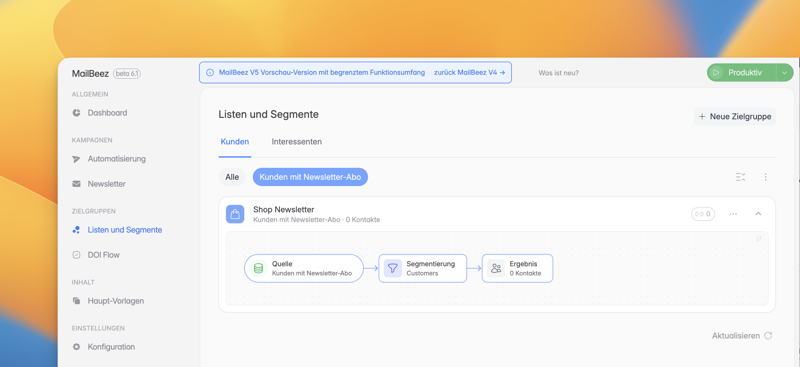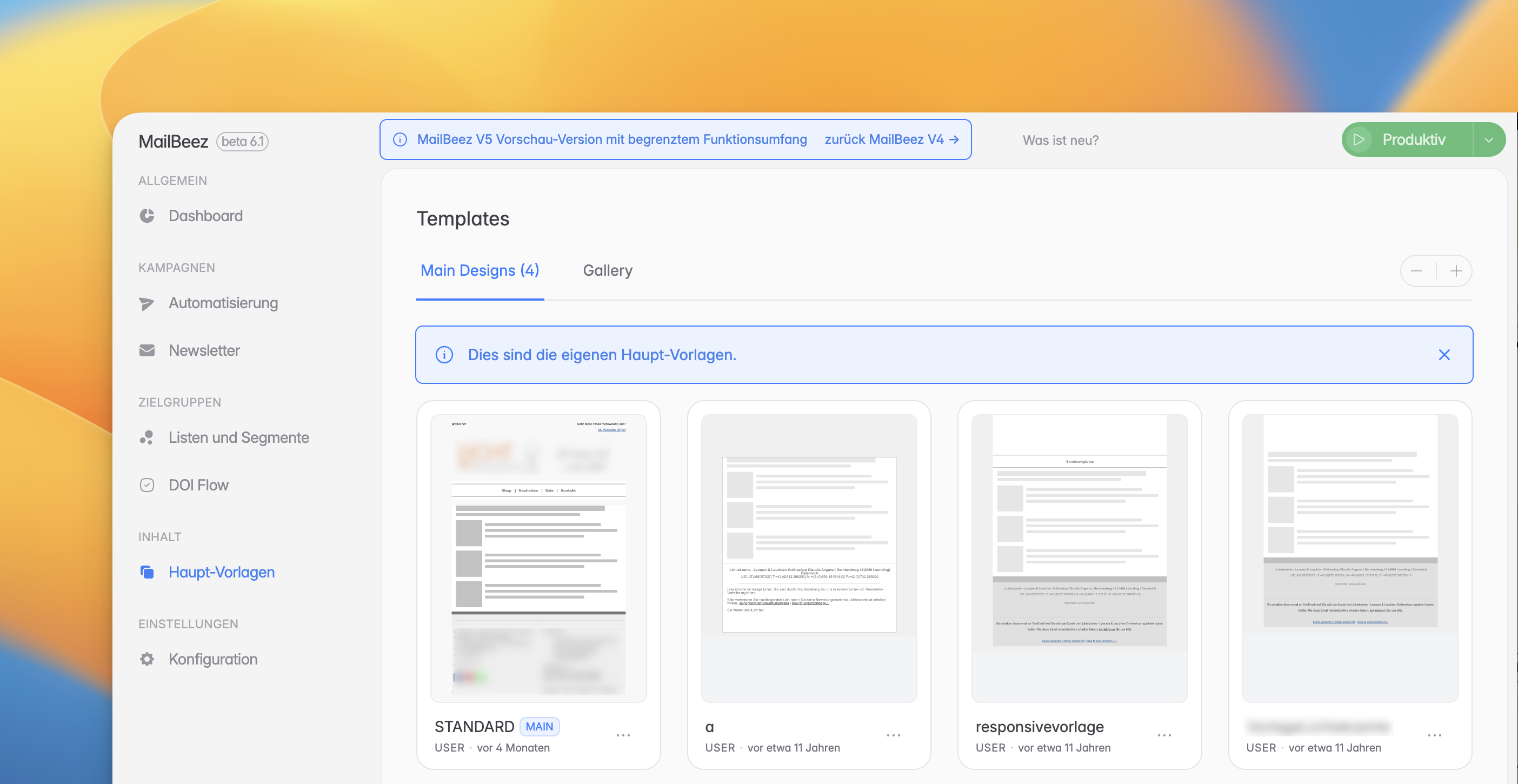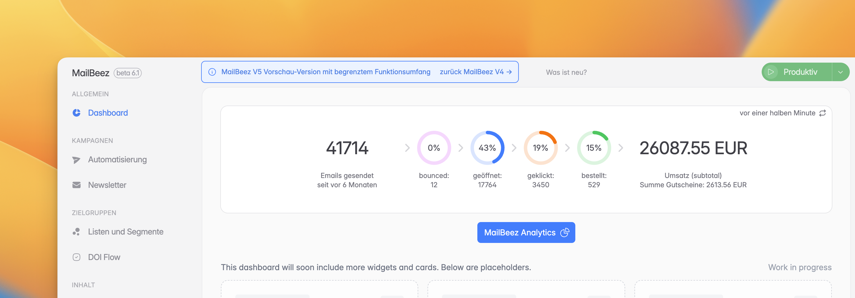 Um MailBeez V5 zu testen, aktualisieren Sie bitte das MailBeez Grundsystem auf v4.9.60+ sowie das Profi‑Paket. In der Administration erscheint daraufhin oben der Link „MailBeez V5 Preview“ – ein Wechsel zurück zur klassischen Ansicht ist jederzeit möglich.