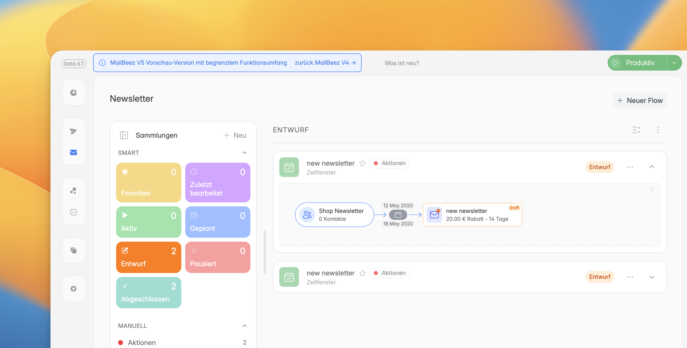 Seit der letzten Beta haben wir intensiv an zahlreichen Optimierungen gearbeitet. Dieses umfassende Update bündelt die Verbesserungen der Beta-Versionen 5 und 6: Freuen Sie sich auf eine verfeinerte Benutzeroberfläche, ein komplett neu gedachtes Newsletter-Konzept sowie einen hochmodernen E-Mail-Editor.