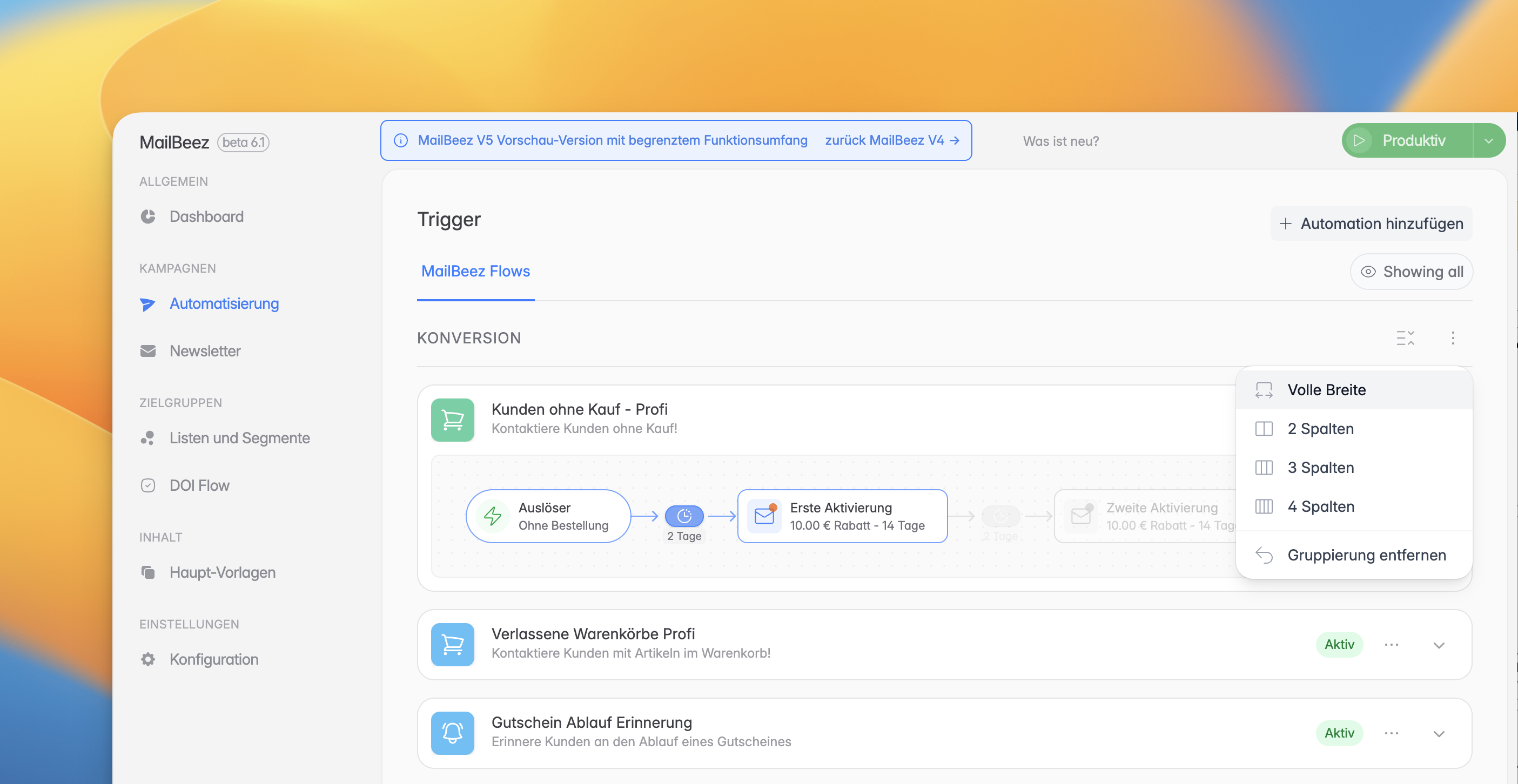 Die Flow-Oberfläche wurde durch optimierte Farben und modernisierte UI-Komponenten weiter aufgewertet. Die Automations-Ansicht erlaubt nun eine Gruppierung nach Touchpoints oder die Nutzung von Pillen-Filtern. Zudem können Sie deaktivierte Module nach Bedarf ein- oder ausblenden und zwischen einer Listen- oder Rasteransicht wählen. Der Double-Opt-In-Flow (DOI) bietet nun eine klare Visualisierung für eine noch einfachere Konfiguration.